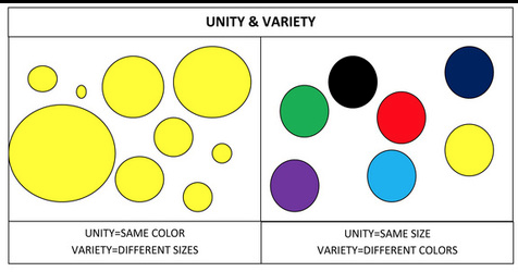 The next example of unity is colour. There is contrast, with the left side, in shape’s sizes, but unity in the colour yellow. As for the right side, there is contrast in the colours, but unity in the shape’s sizes.